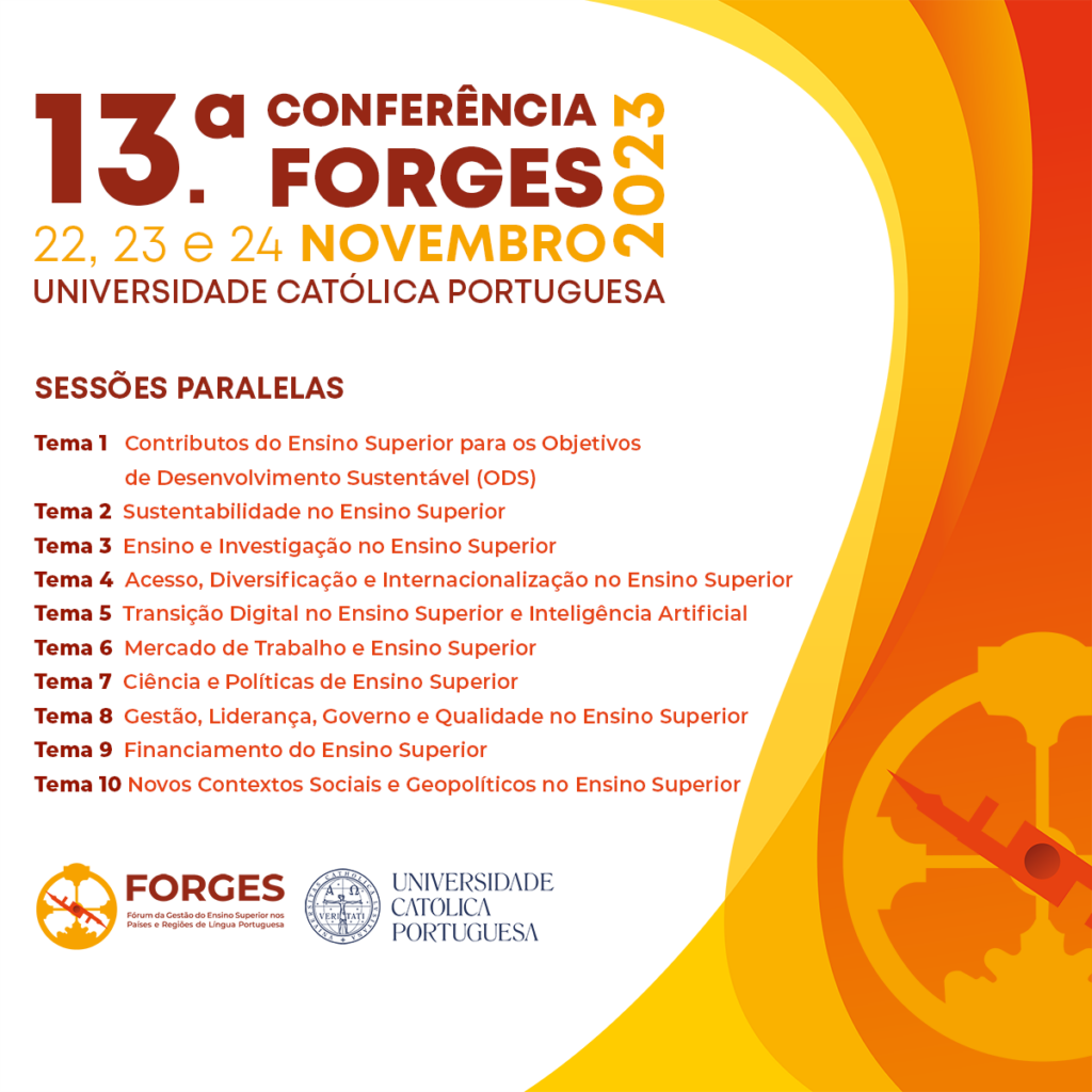 “A 13.ª Conferência FORGES, uma organização conjunta da FORGES e da Universidade Católica Portuguesa, realiza-se entre 22 e 24 de novembro de 2023, em Lisboa. A participação na Conferência poderá ser feita presencialmente, no campus da Universidade Católica Portuguesa em Lisboa, ou a distância. É esperada a participação de investigadores e instituições de ensino superior de Angola, Brasil, Cabo Verde, Guiné-Bissau, Macau, Moçambique, Portugal, São Tomé e Príncipe e Timor.